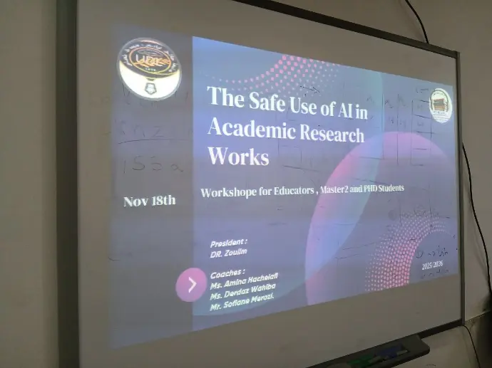 The activity was attended by the Dean of the Faculty, Professor Jalal Abdelkader, accompanied by Professor Bougrara, Vice Dean in charge of Pedagogy. The workshop was supervised by Dr. Hajla Zoulime with the participation of the instructors: Mr. Merazi Sofiane, and professors Derdaz Wahiba and Hachlafi Amina.